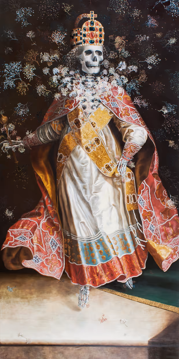 Neben historischen Objekten findet sich auch immer wieder Zeitgenössisches, Nik Hummers Soundinstallation in der Kapelle lässt Maria Theresias Korrespondenzen in die Stille flüstern, ein weiteres Highlight befindet sich im Riesensaal, wo das Porträt des verstorbenen Kaisers durch eines ersetzt wurde, das die aus Japan stammende Künstlerin Haruko Maeda gemalt hat: Es zeigt den Monarchen als grinsenden, sich in Blüten auflösenden König Tod – der im Sterben übrigens nicht allein ist: Dafür sorgt eine von Ausstellungsarchitekt Michael Wallraff entworfene, verspiegelte Tischvitrine, die, einem Schneewittchen-Sarg gleich, im Raum thront. Und rund 750 Sterbebildchen aus der Sammlung des Ferdinandeums aufbahrt: Im Tod sind bekanntlich alle gleich. Bis 10. Jänner 2016.
