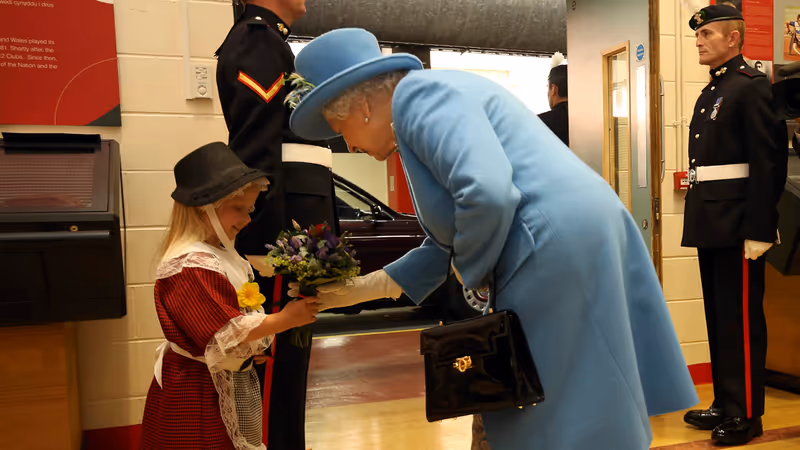 Königin Elizabeth besuchte am Donnerstag Wales. Die kleine Maisie durfte der Queen Blumen überreichen. Kurz darauf bekam sie die Hand eines Soldaten ins Gesicht.