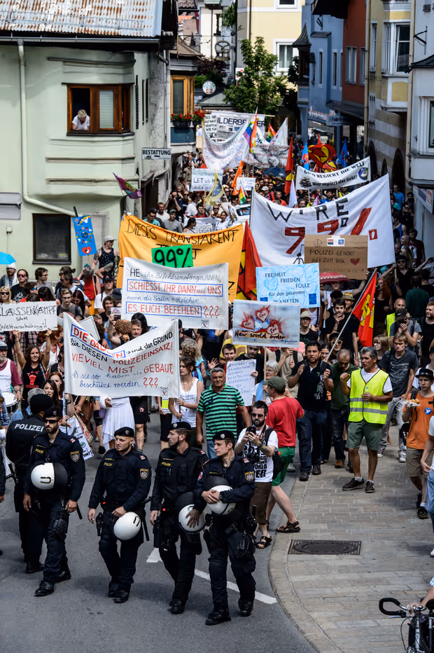 Die Kundgebungsteilnehmer hatten sich gegen 14 Uhr bei strahlendem Sonnenschein und sommerlichen Temperaturen in der Untermarktstraße vor dem Rathaus im Zentrum von Telfs versammelt. Nach einer Aufwärmphase mit musikalischen Protestbeiträgen und dem Skandieren der zentralen Botschaften setzte sich der Protestzug in Bewegung. Unter anderem kritisierten die Teilnehmer die angeblich mangelnde demokratische Legitimation der Konferenz. Eindrücke des Protestmarschs sehen Sie in unserer Bildergalerie.