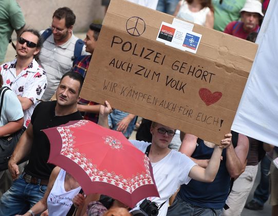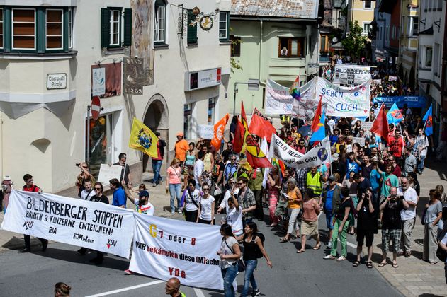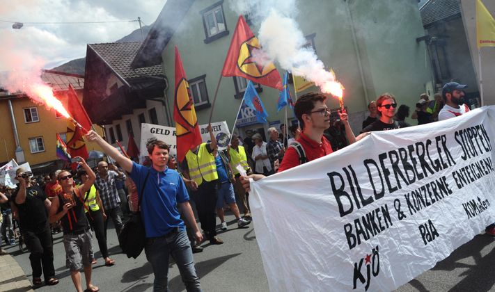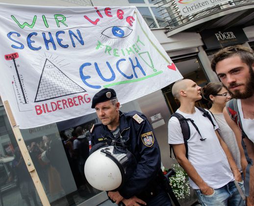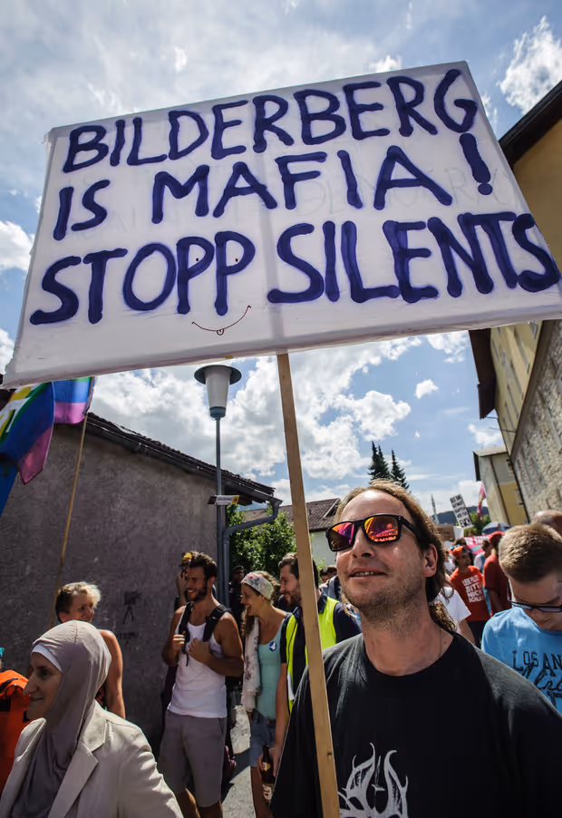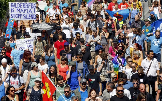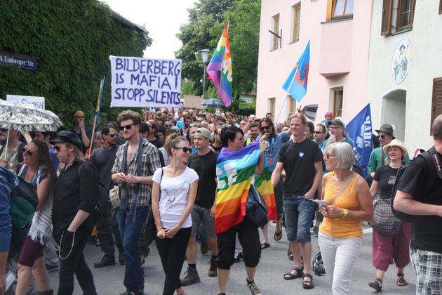Auf großteils selbstgemalten Plakaten waren Slogans wie „Bilderberger - Nix wie Ärger“, „Klassenkampf statt Weltverschwörung“, „NWO - New World Orders - No thanks!“ und „Geld regiert die Welt - Wer regiert das Geld?“ zu lesen. An die zahlreich anwesende Polizei adressierten die Teilnehmer: „Polizei gehört auch zum Volk - Wir kämpfen für Euch!“.
