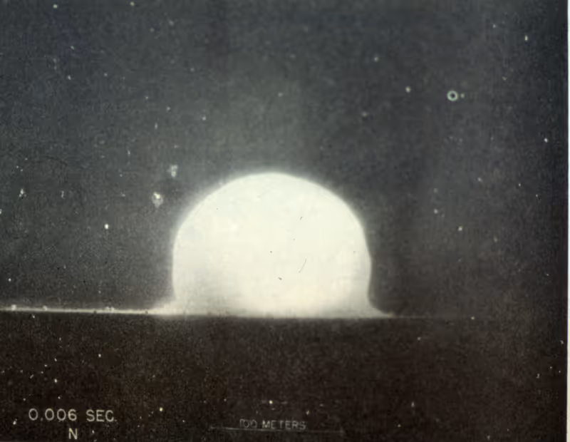 Am 16. Juli 1945, um 5.29:45 Uhr, begann das Atomzeitalter. In der Nähe des Städtchens Alamogordo in der Wüste des US-Bundesstaates Neu-Mexiko wurde die erste Atombombe erfolgreich gezündet. Der Trinity-Test – den Codenamen hatte Robert Oppenheimer, der wissenschaftliche Leiter des Projekts, nach einem Gedicht von John Donne gewählt – übertraf alle Erwartungen. Die Bombe entwickelte eine Energie von 20.000 Tonnen herkömmlichen Sprengstoffs TNT. Der Boden im Versuchsgebiet Ground Zero – von daher auch die Bezeichnung für spätere Zerstörungen, etwa nach den Terroranschlägen vom 11. September 2011 in New York – senkte sich um zwei Meter und wurde zu Glas. Der Atomblitz wurde noch im Umkreis von 300 km bemerkt, die Explosion noch in 160 km Entfernung gehört. Den Journalisten wurde eine vorbereitete amtliche Erklärung übergeben: „Ein großes Munitionslager explodierte heute Morgen in der Nähe des Luftwaffenstützpunktes Alamogordo.“