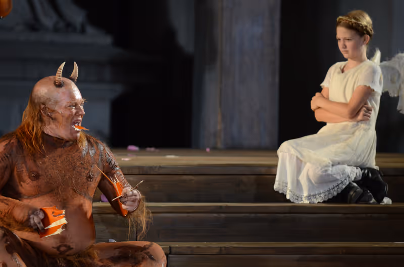 Daran, dass auch die Inszenierung von Crouch und Mertes sich schlussendlich in allzu bigotte Rührseligkeit ergibt, ändert auch Neuzugang Christoph Franken wenig, der seinen Teufel reichlich klamaukhaft anlegt. Überzeugend aber die junge Johanna Bantzer als Verkörperung der zunächst mit dürren Puppengliedmaßen ausgestatteten, verkümmerten Guten Werke und Sven Dolinski als glatter, guter Gesell, der lieber auf der Butterseite bleibt.