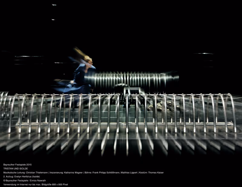 Gut, die Dame hat es ja auch nicht leicht, sie wird von König Marke arg gebeutelt. Schon im ersten Aufzug hat dieser offenbar Isolde nebst Tristan und der jeweiligen Entourage in einen Knast aus lauter Treppenteilen gesteckt. Dort irren alle etwas uninspiriert herum, für zusätzliche Bewegung sorgt ein irre schneller ‚Treppenteillift‘ in der Mitte. Einen Liebes- oder Todestrank nimmt hier niemand zu sich, er wird einfach ausgeschüttet. Zu Recht, denn das Paar liebt sich spürbar auch so. Es trägt blaue Kleidung, das Dienstpersonal gewandet sich gräulich grün, die Bösen kommen in Senfgelb daher. Eigentlich recht spannend, dieser Raum, und auch die Bühne des zweiten Aufzugs weckt Interesse. Nun sieht man einen veritablen Folterkeller, oben sind Markes Wachen, die Kurwenal mit Scheinwerfern blenden. Tristan und Isolde kämpfen unterdessen mit einem Stahlungetüm, an zwei offenbar sehr spitzen Streben fügen sie sich absichtlich Verletzungen zu. Todeswunsch wegen auswegloser Lebens- und Liebessituation, das ist klug gedacht. Doch leider gerät der finale Aufzug dann nur noch banal und zudem handwerklich ungeheuer klapprig. Tristan wurde von Markes Schergen Melot verletzt, nun imaginiert er im Fieberrausch Isolde herbei. Dabei umgeben ihn ein paar Getreue sowie einige Grablichter … Isolde taucht als Vision in diversen Leucht-Dreiecken auf, mal als winkende Statistin, mal als Puppe, die den Kopf verliert. Endlos schleppt sich die Sache dahin, zweimal wird Tristan grabfertig gemacht, wieder ausgepackt, auf eine seltsame Chaiselongue gesetzt. Als Isolde endlich realiter kommt, setzt sie sich neben ihn, Marke erscheint und es gibt ein undurchsichtiges Nebenfiguren-Gemetzel. Hernach packt Marke Isolde und schleppt sie weg.
