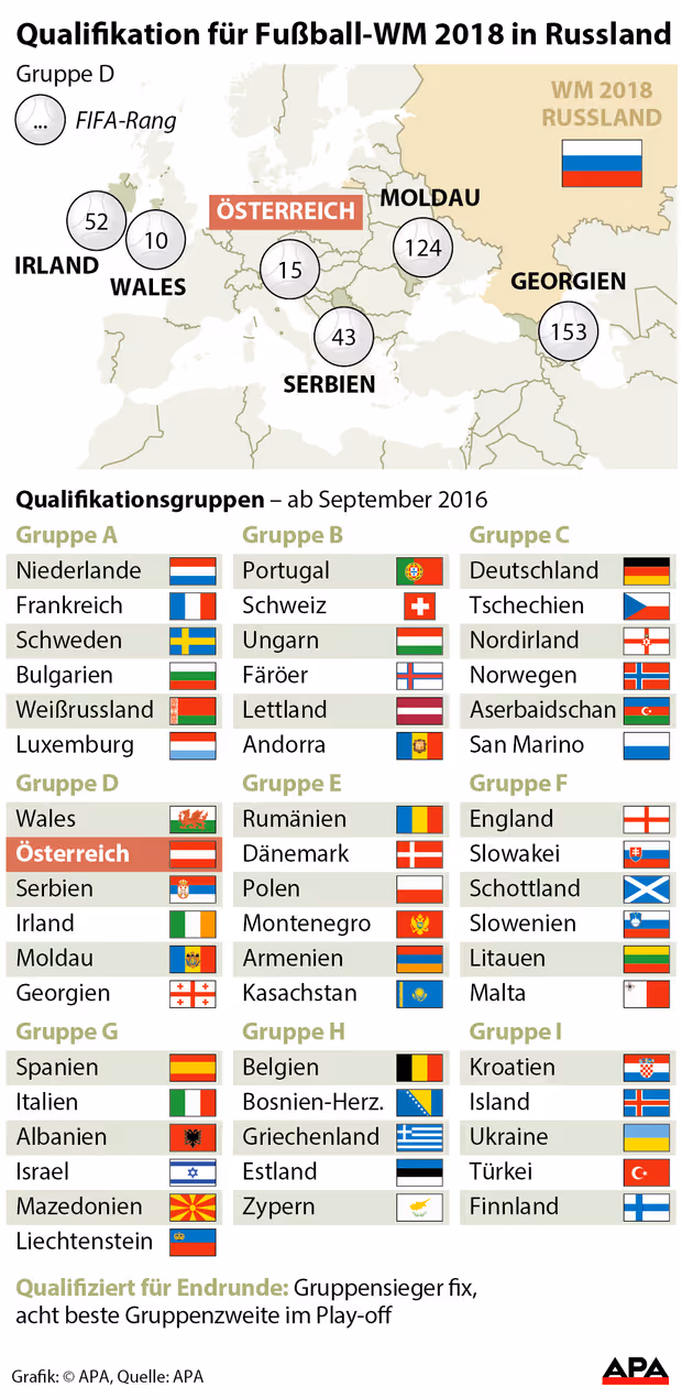 Österreich wurde aus Topf zwei in die vierte Gruppe gezogen, in der mit Serbien und Irland schon zwei starke Gegner warteten. Aus dem Topf eins allerdings entgingen Alaba und Co. den Top-Nationen und erhielten mit dem Weltranglisten-Zehnten Wales den Aufsteiger der vergangenen Monate zugelost.