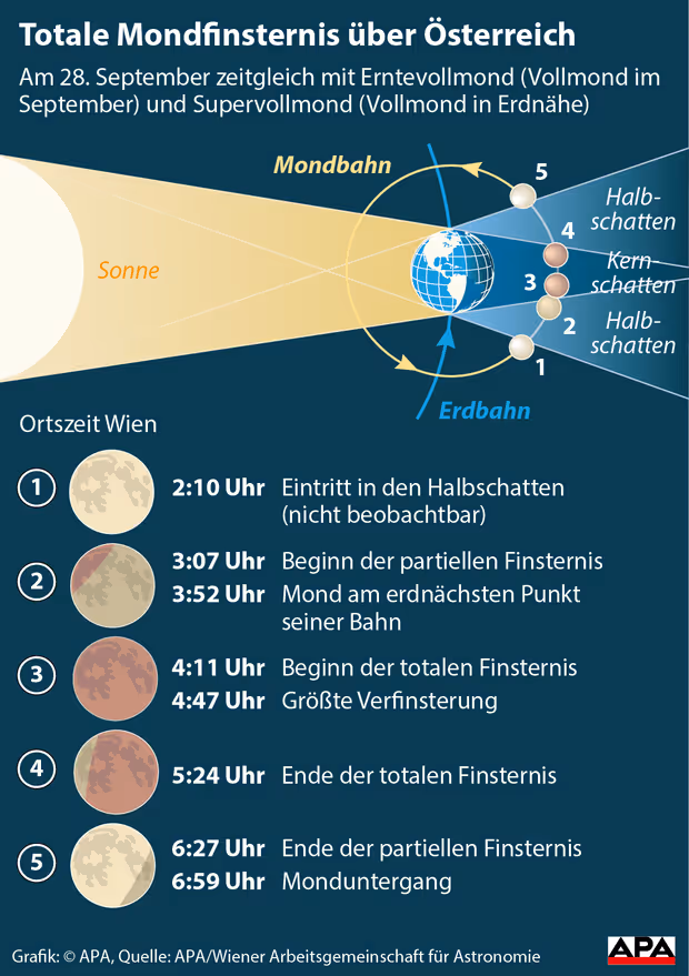 Die Finsternis beginnt - für Astronomen, mit freiem Auge aber nicht wahrnehmbar - am Montag, 28. September, um 2.10 Uhr, sobald der Mond in den Halbschatten der Erde eintritt. Erst um 3.07 beginnt der Kernschatten der Erde kontinuierlich die Mondscheibe abzudecken, der Mond steht zu diesem Zeitpunkt im Südwesten. Zwischen 4.11 und 5.24 Uhr ist der Mond dann total verfinstert. Weil ein Teil des Sonnenlichts von der Erdatmosphäre gestreut wird und dennoch auf die Mondoberfläche trifft, entsteht eine rötliche Färbung des Erdtrabanten. Um 6.27 Uhr ist dann kein Erdschatten mehr am Mond zu erkennen.