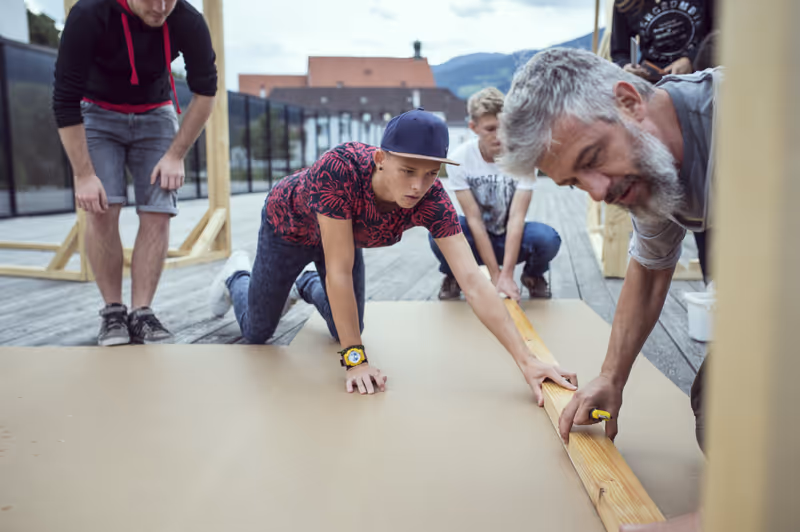 Fassaden für kleine Holzhäuschen werden hier bemalt, ein „illusionistisches Dorf der Kinderrechte“ ist am Entstehen. Mehrere Spiel- und Kreativworkshops sind im Rahmen des zweiwöchigen Kunst- und Bildungsprojektes „Das Recht, ein Kind zu sein“ angesetzt. Unter Federführung der Initiative „Lass die Kinder spielen“, die die beiden Künstler Lukas Hüller und Hannes Seebacher 2000 ins Leben gerufen haben, wird gehämmert und gezimmert. „So ein größenwahnsinniges Projekt haben wir hier überhaupt noch nie gemacht“, sagt eine Schülerin der siebten Klasse freudestrahlend. 500 Kinder und Jugendliche werden bei der abschließenden Großbild-Inszenierung diesen Freitag am Oberen Stadtplatz Hall mit dabei sein. Solche großformatigen „Wimmelbilder“ hat der Fotograf Lukas Hüller bereits in mehreren Ländern realisiert. Das Gemälde „Die Kinderspiele“ von Pieter Bruegel diente als Ausgangspunkt seiner aufwändigen Inszenierungen, in denen stets das Spiel im Zentrum steht. Auch im Flüchtlingslager Saatari ist eine Fotografie entstanden, die Momentaufnahme mit dem Titel „Post Refugee City“ wurde im Rahmen der Linzer Ars Electronica präsentiert. Hunderte Kinder der 80.000 Einwohner zählenden Containerstadt im Norden Jordaniens konnten sich trotz anfänglicher Skepsis rasch für das Projekt begeistern. Sie bilden gemeinsam einen Baum, wo dieser Wurzeln schlägt, keimt der Same der Hoffnung. „Schatten war das ursprüngliche Thema in Saatari“, erzählt der Tiroler Hannes Seebacher.