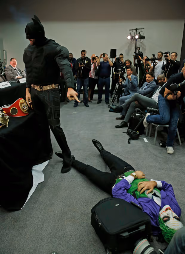 London – Herausforderer Tyson Fury hat Boxweltmeister Wladimir Klitschko mit Mätzchen zu provozieren versucht. Als Batman verkleidet nahm der Brite am Mittwoch bei einer Pressekonferenz in einem Londoner Hotel vor dem Mikrofon Platz, sprang anschließend über den Tisch und wälzte sich mit einem als Comicfigur Joker verkleideten Mann am Boden.