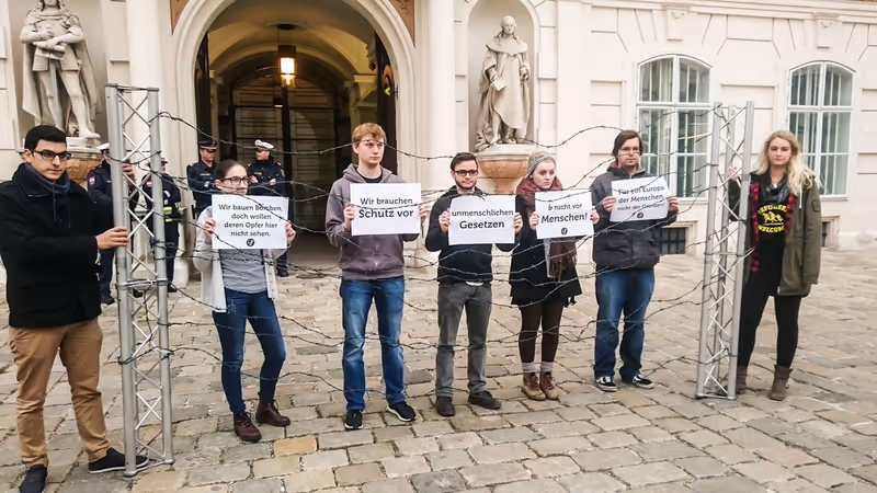 Die Sozialistische Jugend (SJ) hat am Mittwoch gegen die Flüchtlingspolitik Österreichs und der EU protestiert und zu diesem Zweck einen Zaun aus Stacheldraht vor dem Außenministerium errichtet. Zentrale Forderung der jungen Roten sind "sichere Fluchtrouten" sowie die Möglichkeit, in Botschaften Asyl zu beantragen.