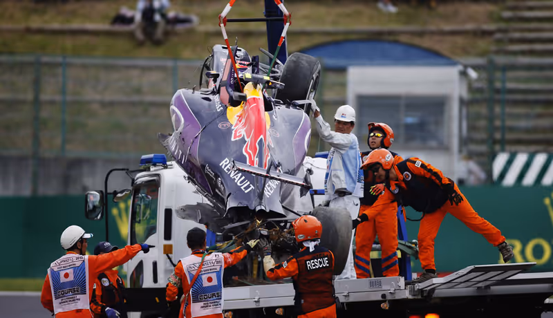 Der Russe kam auf trockener Strecke mit seinem Rennwagen auf den grünen Teppich neben die Strecke und verlor die Herrschaft über das Fahrzeug. Das Auto krachte zunächst mit dem Heck in die Streckenabsicherung und überschlug sich. Die linke Hälfte des RB11 wurde dabei praktisch abgerissen.