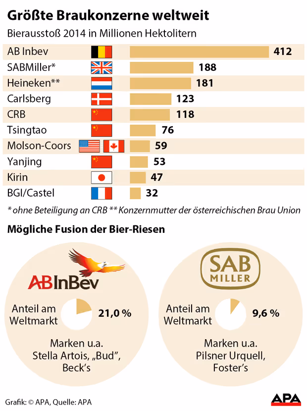 Als Leidtragender eines Zusammenschlusses der beiden Platzhirsche gilt vor allem der bisher Drittplatzierte Heineken (Amstel, Desperados). Die Niederländer kaufen nun ihrerseits dem britischen Spirituosenkonzern Diageo Teile seines Biergeschäfts ab. Für mehrere Beteiligungen bezahlt der Brauer insgesamt 696 Mio. Euro. Heineken baue damit sein Standbein in Märkten wie Südostasien und der Karibik aus, teilte der Konzern am Mittwoch mit.
