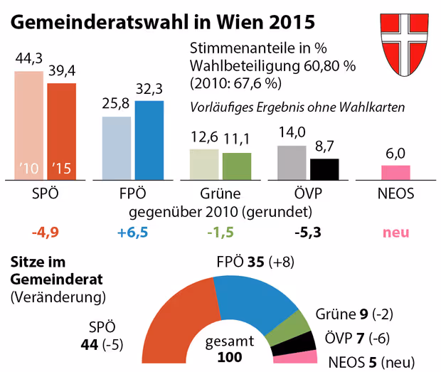 Die Grünen überholten mit 11,1 Prozent trotz Verlusten die ÖVP, die mit 8,7 Prozent (2010: 13,99 Prozent) das schlechteste schwarze Ergebnis aller Zeiten einfuhr. Sicher den Sprung in den Wiener Landtag geschafft haben die NEOS, die im vorläufigen Endergebnis mit 6,0 Prozent ausgewiesen werden.