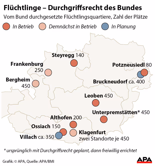 Insgesamt wurden bisher neun Quartiere in fünf Bundesländern geschaffen. Besonders oft kam das Durchgriffsrecht des Bundes in Kärnten zur Anwendung.