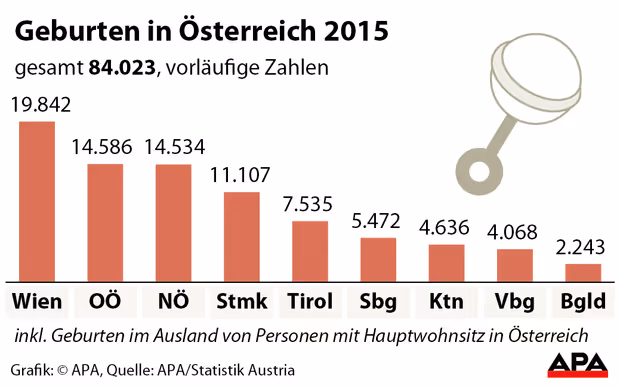 In der Zahl von 84.023 Neugeborenen sind 504 Babys enthalten, deren Eltern in Österreich wohnen, die aber im Ausland zur Welt gekommen sind. Ebenfalls nach vorläufigen Zahlen wurden nach dieser Zählweise 82.553 Sterbefälle verzeichnet. Demzufolge fiel die vorläufige Geburtenbilanz im Jahr 2015 mit einem Plus von 1470 positiv aus. Eine positive Geburtenbilanz war auch 2014 erzielt worden.
