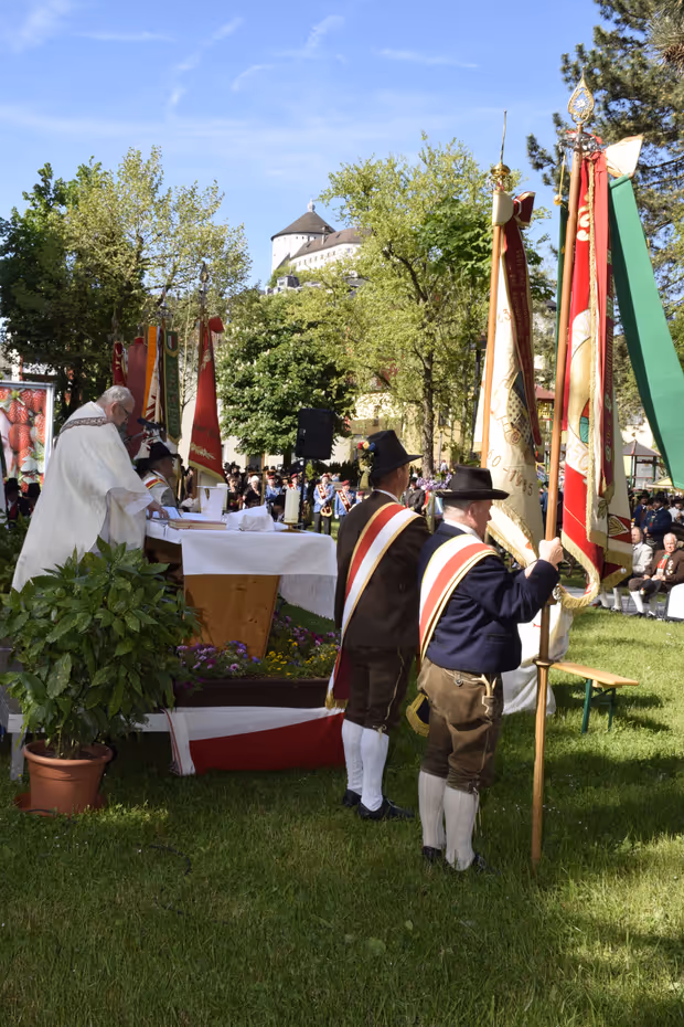 Kufstein –Es war ein gewaltiges Bild, das sich am zweiten Tag des Landestrachtenverbandsfestes in Kufstein bot: Mehr als 2600 Trachtler und Abordnungen von Musikkapellen, Schützen und Traditionsvereinen wohnten der von Stadtpfarrer Thomas Bergner zelebrierten Feldmesse im Kufsteiner Stadtpark bei.