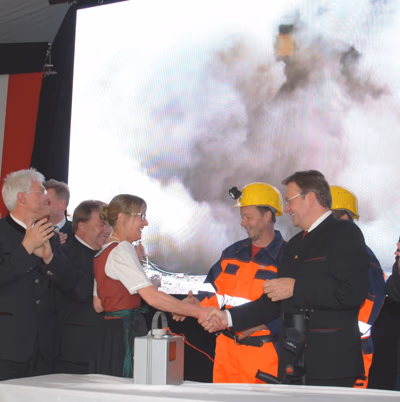 Patin Andrea Geiger löste am Sonntag den ersten Sprengschuss in „ihrem“ Tunnel aus. Hunderte Besucher bei Asfinag-Feier in Landeck-Perjen.