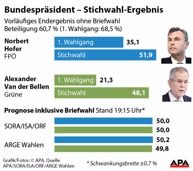 Zwar hat der Freiheitliche laut vorläufigem Endergebnis Vorsprung, doch dürfte Van der Bellen bei den Briefwählern noch deutlich aufholen. Sowohl ARGE Wahlen als auch SORA sehen die beiden damit innerhalb der Schwankungsbreite. Wer am 8. Juli Heinz Fischer nachfolgt, ist somit komplett offen.