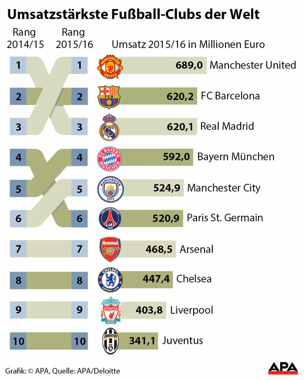 ManUnited steigerte den Umsatz gegenüber der Vorsaison um gewaltige 169,5 Mio. Euro. Der Club von Trainer Jose Mourinho löste damit Champions-League-Sieger Real Madrid nach elf Jahren an der Spitze der Rangliste ab. ManU, Barcelona und Real haben erstmals die Marke von 600 Mio. Euro Umsatz übertroffen. Dahinter folgt der deutsche Meister Bayern München, der gegenüber der vorangegangenen Saison eine große Steigerung um 118 Mio. Euro auf 592 Mio. Euro aufwies.