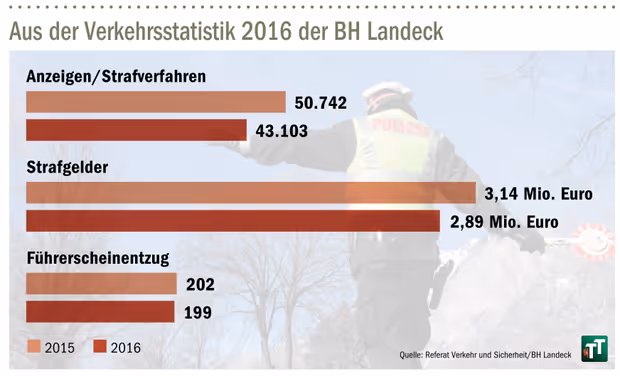 Rückläufig ist auch die Summe der Strafgelder: 2,89 Mio. Euro landeten 2016 in den Kassen der Strafbehörde, ein Jahr zuvor waren es noch 3,14 Mio. Euro. Das Geld aus Übertretungen der Straßenverkehrsordnung (2,13 Mio. Euro) floss in die Kassen der Straßenerhalter Land, Asfinag und Gemeinden. Wer eine Strafe nach dem Kraftfahrgesetz ausfasst, „sponsert“ die Sozialhilfe des Landes Tirol. Im Vorjahr kamen 353.000 Euro aus dem Bezirk Landeck.