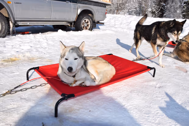 Nach etlichen Runden auf der Trainingsstrecke sind die Vierbeiner buchstäblich hundemüde. Zurück am Wohnwagen legen sich ein paar von ihnen auf ihre hochgestellten „Betten“, die sie vor der Bodenkälte schützen, und ruhen sich aus. Andere tapsen aufgeregt hin und her. Denn sie wissen: Nach getaner Arbeit wartet eine Belohnung auf sie. „Das habt ihr euch verdient“, sagt Elisabeth Probst und holt etwas aus dem Wohnwagen, das aussieht wie ein Stück Schokolade. „Das ist Kraftfutter“, erklärt sie.