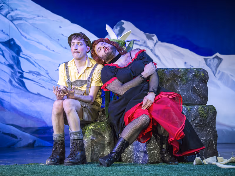Innsbruck –Es ist einigermaßen müßig, darüber zu sinnieren, ob der austropopulär aufgemotzte „Rustical“-Dauerbrenner „Der Watzmann ruft“ nun tatsächlich auch in den Kammerspielen des Tiroler Landestheaters aufgeführt werden muss. Muss er natürlich nicht. Aber sei’s drum. Der „Watzmann“ ist da – und er macht Spaß. Ziemlich viel Spaß sogar. Wobei er – vorlagengetreust – weniger durch feingeistigen Hintersinn punktet, sondern durch Hintern. Mit dem nämlich springt das Stück aus der Feder von Manfred Tauchen und Wolfgang Ambros in Verena Schoppers Inszenierung dem Zuschauer ins Gesicht. Und das bereits bevor es richtig begonnen hat. Denn eingeläutet wird die Schicksalsbergschwank-Satire schon im Foyer: Mit Kuhglockengebimmel wird das Publikum auf die Alm getrieben. Benjamin Schardt gibt den nachlässig befrackten, auf punktgenauen Beginn pochenden Einpeitscher. Was ihm an Hemd fehlt, macht ein zierliches Edelweiß als Kopfschmuck wieder gut. Zur Vorbereitung blieben dem Schauspieler nur wenige Tage. Er sprang für den erkrankten Gerhard Kasal ins bunte Getümmel – und wenig später als zur geübten Befummelung bereite Gailtalerin in Fummel.