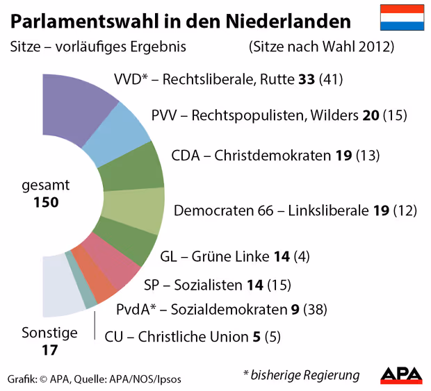 Da Ruttes sozialdemokratischer Koalitionspartner noch stärkere Verluste erlitt als er selbst, muss er sich nach neuen Verbündeten für die Bildung einer Regierung umschauen. Es stehen lange und schwierige Koalitionsverhandlungen bevor, da mindestens vier Parteien die Regierung bilden werden. Fest steht, dass Rutte deutlich nach rechts gerückt ist, um eine Abwanderung seiner Wähler in Richtung Wilders zu verhindern. In Brüssel wird damit gerechnet, dass sich dies auch auf Standpunkte der Niederlande in der EU-Politik auswirken könnte - zum Beispiel in der Migrations- und Asylpolitik.