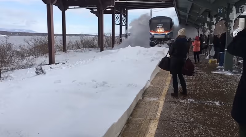 In der Nähe von New York City fährt ein Amtrak-Zug — eine Linie, die das US-Zugunternehmen National Railroad Passenger Corporation betreibt — in den Bahnhof ein. Auf den Gleisen der Haltestation liegt noch jede Menge Schnee. Was nun passiert, scheint zu erahnen, denn viele der am Bahnsteig wartenden Zuggäste haben ihr Smartphone gezückt und filmen. Mit enormen Tempo braust der Zug in die Station ein und lässt die Schneemassen auf die Menschen am Gleis niederprasseln.