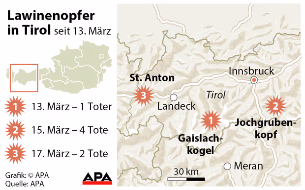 Allein in dieser Woche kamen bei Lawinenabgängen in Tirol damit sieben Wintersportler ums Leben. Am Donnerstag waren vier Schweizer Tourengeher am Jochgrubenkopf in Schmirn von einem gigantischen Schneebrett in den Tod gerissen worden. Die Opfer waren bis zu zwölf Meter unter der Schneedecke verschüttet, hunderte Einsatzkräfte suchten stundenlang die Schneemassen ab. Wie es zu dem Unglück kam, ist derzeit noch Gegenstand von Ermittlungen.