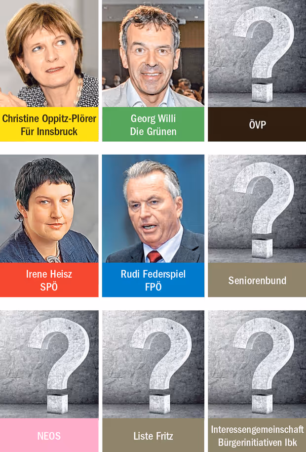 Weitere personelle Fragezeichen: Tritt der Seniorenbund wieder mit Helmut Kritzinger an und wen schicken die NEOS ins Innsbrucker Rennen? Gänzlich unklar ist derzeit noch ein Antreten der Liste Fritz sowie der Interessengemeinschaft Bürgerinitiativen Innsbruck. (mami)
