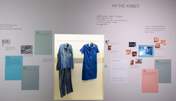 Slavko Ivanovic´ kam 1969 aus dem damaligen Jugoslawien nach Österreich. 13 Jahre lang machte er Nachtschichten am Innsbrucker Standort der Vorarlberger Textilfabrik Herrburger und Rhomberg. Die blaue Arbeitsmontur, die jetzt im Volkskunstmuseum zu sehen ist, erhielt er an seinem ersten Arbeitstag. Das schwarze Wandtelefon, das die aus der Türkei stammende Nevin Genç sich 1972 von ihren ersten Löhnen gekauft hat, brachte Unabhängigkeit vom öffentlichen Münztelefon in Imst, wo Genç als 20-Jährige in der Textilfabrik Jenny & Schindler zu arbeiten begonnen hatte. Im Wohnheim teilten sich anfangs sieben Frauen drei Betten. Das Unternehmen stellte Besteck zur Verfügung: Am Stiel des Löffels, den Genç heute noch besitzt, ist ein Hakenkreuz eingraviert – das Besteck stammte offensichtlich von einer Organisation der nationalsozialistischen Deutschen Arbeiterfront.