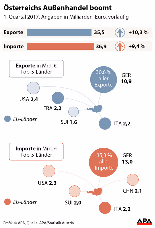 Im ersten Quartal 2017 stiegen die Importe nach Österreich im Vergleich zur Vorjahresperiode um 9,4 Prozent auf 36,9 Milliarden Euro ebenfalls kräftig, aber nicht ganz so stark wie die Exporte. Dadurch sank das Außenhandelsdefizit von 1,6 auf 1,4 Milliarden Euro. (APA)