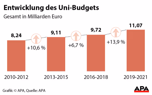 Der Ansteig des Uni-Budgets ist dabei deutlicher als in den vergangenen Dreijahresperioden. So betrugen die Mittel im Zeitraum 2010 bis 2012 8,24 Mrd. Euro. Für 2013 bis 2015 wuchsen sie um 10,5 Prozent auf 9,11 Mrd. Euro, anschließend für den Zeitraum 2016 bis 2018 um 6,8 Prozent auf 9,72 Mrd. Euro.