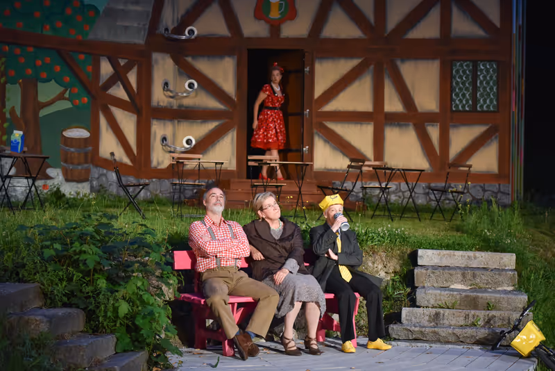 Wahl-Kuddelmuddel ist man hierzulande gewohnt. Und so gesehen hat Autor und Regisseur Manfred Schild in seinem Stück „Die Kluibenschädel-Saga“, das am Freitag bei den Schlossbergspielen Rattenberg Premiere hatte, ein brisantes Thema aufgegriffen – das er auf der Open-Air-Bühne allerdings nicht politisch-analytisch, sondern märchenhaft aufbereitet. Im putzigen Bühnenbild, das an aufgeschlagene Bilderbücher erinnert, führt ein Erzähler (Wolfgang Oehm) durch den kurzweiligen Schwank, der bei der Premiere feucht-fröhlich endete. Die zweite Hälfte des Abends fand nämlich in strömendem Regen statt, was der guten Laune aber nicht viel anhaben konnte. Schild hat dem Laien-Ensemble liebenswert-lustige Charaktere auf den Leib geschrieben und seinen Stoff mit etlichen Anspielungen aus der Film- und Theaterwelt gespickt: In Niederober-Unterberg prallt der „Jedermann“ auf „Mission Impossible“ und „Star Wars“, bis die Dorfgemeinschaft zum finalen „Time Warp“ ansetzt. Ein bisserl „Rocky Horror Picture Show“ schadet nie.