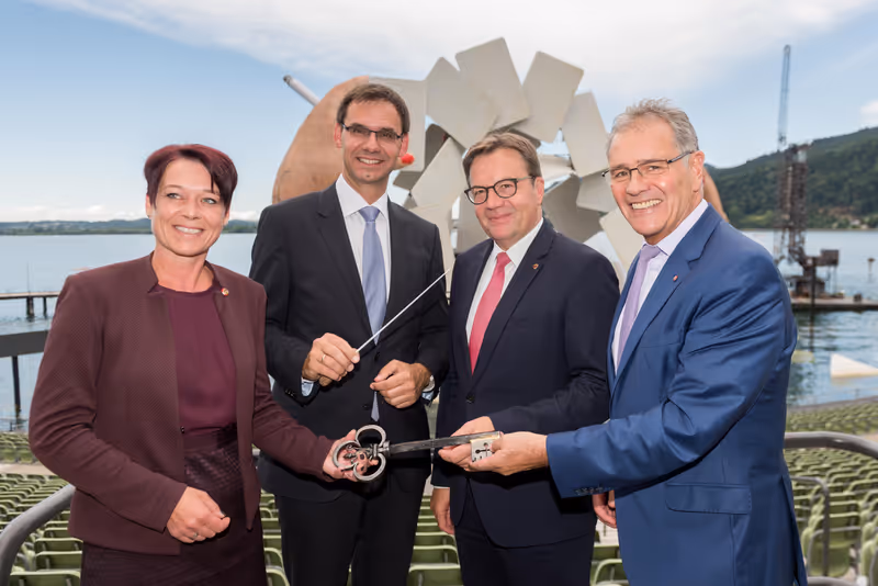 Ritualisierte Schlüsselübergabe: Bundesratspräsidentin Sonja Ledl-Rossmann und Günther Platter treten den Vorsitz in der Landeshauptleutekonferenz an Markus Wallner und im Bundesrat an Edgar Mayer (r.) ab.