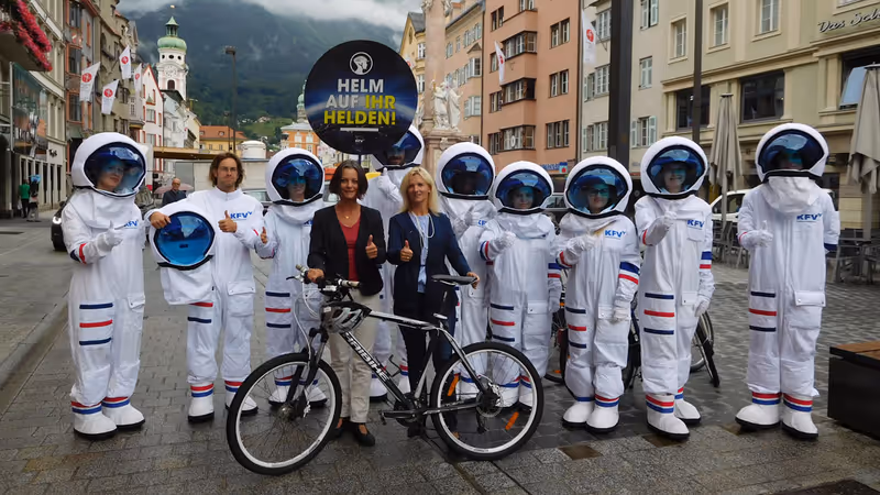 Innsbruck –Astronauten in der Innsbrucker Innenstadt? Was aussieht wie ein Betriebsausflug der NASA, ist eine Straßenaktion des Kuratoriums für Verkehrssicherheit (KFV) unter dem Motto „Helm auf, ihr Helden!“. Seit Einführung der Helmpflicht für Kinder sei das Tragen eines Schutzhelms für kleine Radfahrer fast selbstverständlich, erklärt Gabriele Zunegg vom KFV. Bei Jugendlichen und Erwachsenen gebe es hingegen „großen Aufholbedarf“. Ganz besonders in Tirol: Mit einer Helmtragequote von nur 19 Prozent (Österreich-Schnitt: 29 %) sind die Tiroler österreichweit Schlusslicht. Dabei komme es bei fast jedem achten Radunfall zu Kopfverletzungen, warnt Zunegg. Ihr Ziel: Das Tragen eines Helms solle so selbstverständlich werden wie beim Skifahren.