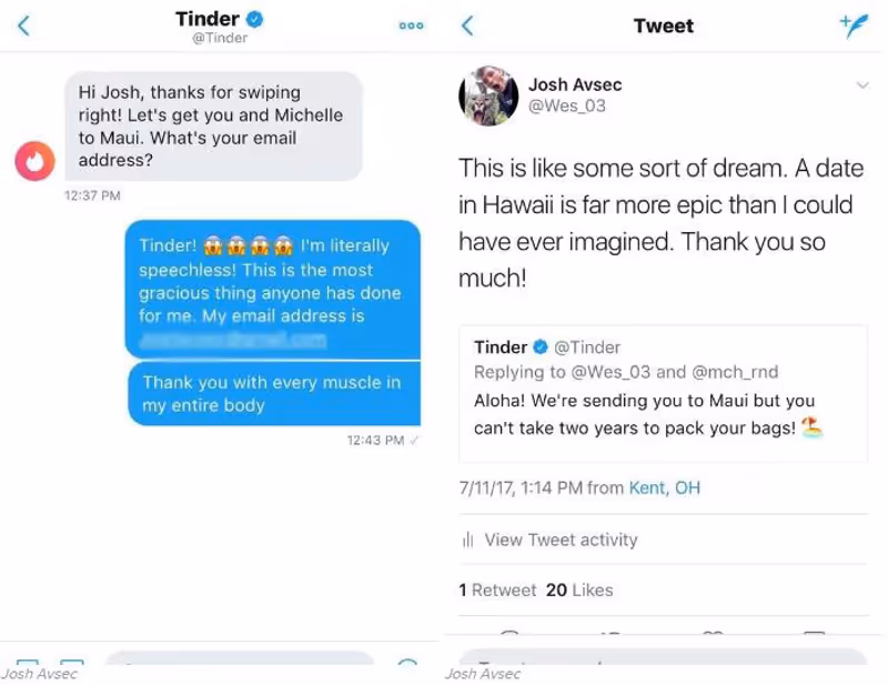Joshs Twitter-Posting ging mit 100.000 Likes, 34.000 Retweets und hunderten Kommentaren dermaßen viral, dass nicht nur Michelle, sondern sogar die Dating-App höchstpersönlich davon Wind bekamen. Vier Tage später kam Tinder mit einem Angebot um die Ecke, das die beiden Noch-nicht-Verliebten nicht ausschlagen konnten. „Es wird Zeit, dass ihr euch trefft. Ihr habt 24 Stunden Zeit um euch eine Stadt für euer erstes Date auszusuchen. Wir schicken euch dann dorthin!"