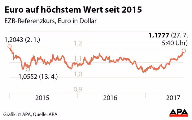 Grund für den starken Euro sind gesunkene politische Unsicherheiten in der EU und die anziehende Wirtschaft. Gleichzeitig schwächt das sinkende Vertrauen in US-Präsident Donald Trump den US-Dollar.