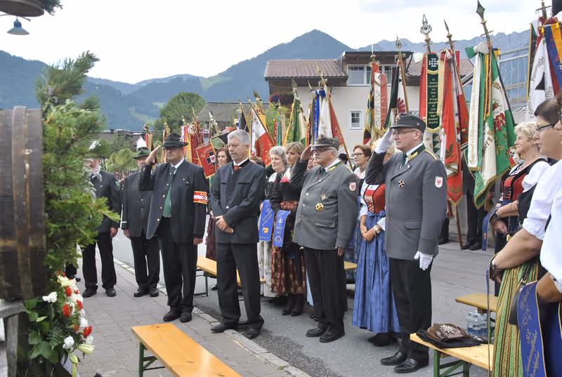 Auf dem Fischerangerl in Walchsee zelebrierte Pfarrer Thomas Bergner die heilige Messe, anschließend legten die Mitglieder des Landesverbandes einen Kranz nieder, zu Ehren der gefallenen Soldaten der beiden Weltkriege.
