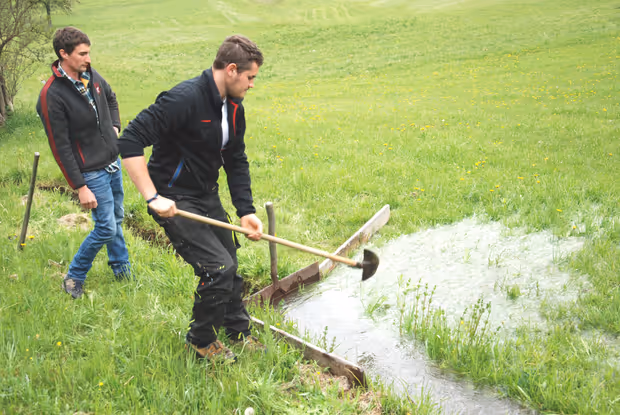 Dort hält der Nebenerwerbsbauer Andreas Schöpf mit den Söhnen Matthias und Lukas die Waale in Schuss, 22 Hektar werden bewässert: „Es freut uns, dass unsere traditionelle Bewässerungsanlage auf Interesse stößt.“