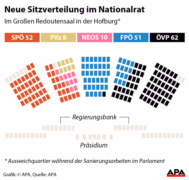Klubs gibt es im künftigen Nationalrat fünf, wie dies schon von 1994 bis 1999 und dann von 2006 bis 2013 der Fall war. In der vergangenen Gesetzgebungsperiode waren es erstmals sechs Fraktionen, wovon das Team Stronach durch Nicht-Kandidatur und die Grünen durch ihre Wahlschlappe wegfielen. (APA)