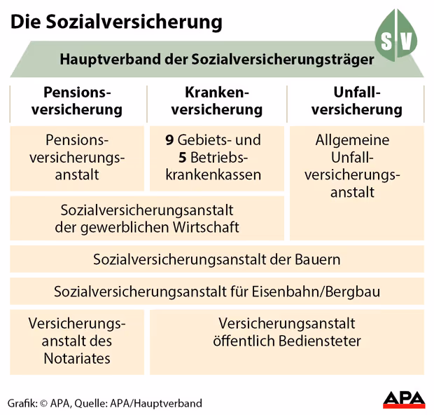 Die neun Gebiets- und die fünf Betriebskrankenkassen sind für die Krankenversicherung zuständig, für die beiden anderen Sparten die Allgemeine Unfallversicherungsanstalt (AUVA) und die Pensionsversicherungsanstalt (PVA). Als Spezialfall haben die Notare noch eine eigene Pensionsversicherung.