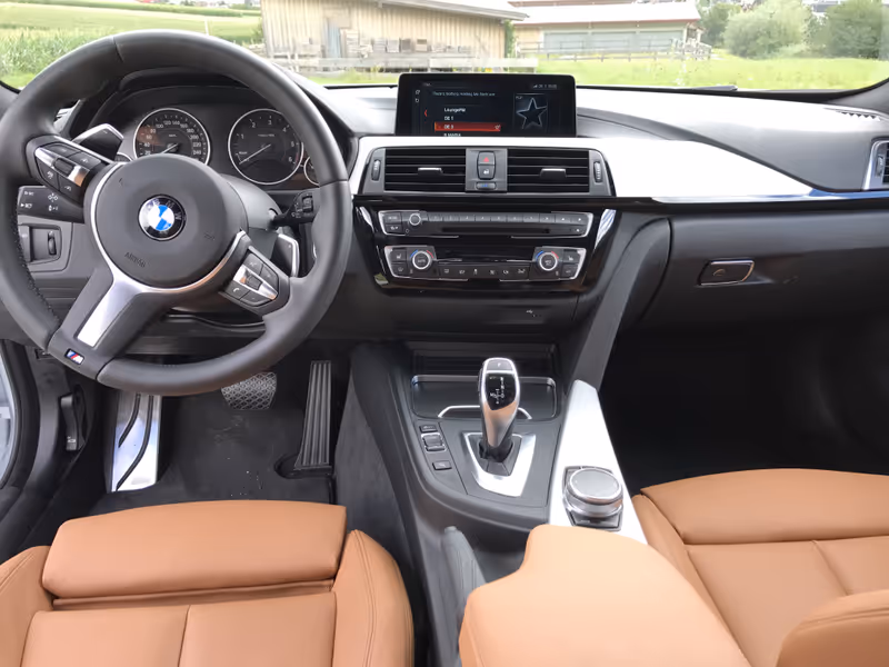 Zweiteres merkten wir auch beim Einsteigen, als uns die Sportsitze unseres Bayern einen herzlichen Empfang bereiteten. Das Interieur fällt – BMW-typisch – durch hochwertige Materialien und ausgezeichnete Verarbeitung auf. Eine zusätzliche Ziernaht und Chrom-Applikationen sollen einen noch hochwertigeren Eindruck vermitteln als bisher. Das bekannte Navigationssystem Professional kommt nun auch im 4er zum Einsatz und verfügt über eine neue Oberfläche, die bei Bedarf bis zu sechs unterschiedliche Informationskacheln anzeigt. Gegen Aufpreis wechselt das neue multifunktionale Instrumentendisplay seine Anzeigeart je nach Fahrstil: rot im Programm Sport, blau bei Eco Pro und im Comfort-Modus werden klassische Instrumente mit schwarzem Hintergrund angezeigt. Dass die elegante Form ihren Tribut fordert, merkt man speziell in der hinteren Reihe. Wer die 185 Zentimeter Körpergröße knackt, der muss Kopf und Knie leicht einziehen. Mit dem Kofferraum sollte man hingegen ein leichtes Auskommen finden: Er lässt sich von standardmäßigen 480 Litern auf 1300 Liter erweitern.