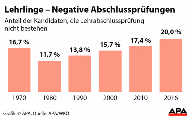 Dennoch waren nur 80 Prozent der Prüfungen positiv, das ist der niedrigste Wert, den es je gab. In den Jahren davor lag die Rate der positiven Prüfungen zwischen 81 und 83 Prozent, in den 1980er Jahren noch bei bis zu 88 Prozent, geht aus der Lehrlingsstatistik der Wirtschaftskammern Österreichs hervor.