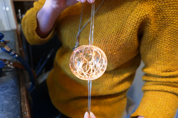 Jetzt zeigt sich, warum die Stringers zuvor in das kalte Röhrchen gefüllt wurden: Die Künstlerin bläst in ein Ende – wie in einen kleinen Luftballon, der größer und größer wird. Eine Kugel bildet sich, wächst, bis sie faustgroß ist. Die Fäden sind im Inneren der Glashaut sternförmig zu einem bunten Netz verschmolzen, das sich in alle Richtungen spannt. Schnell noch die beiden Enden versiegelt und fertig ist der Christbaumschmuck.