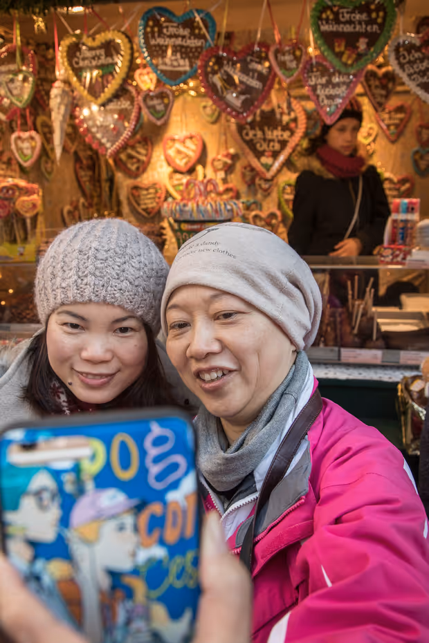 Zwei Chinesinnen tun indes das, was Asiaten halt so tun: Sie machen Selfies von sich und den Lebkuchenherzen mit Zuckerschrift. Eine hält einen Stanitzel mit Kastanien in den Händen. Ob sie das auch von zuhause kenne? „Ja, das gibt es bei uns auch", sagt die Chinesin begeistert. Was aber diese Kiachl seien, die es an dem Stand gebe, an dem die Menschen Schlange stehen, will sie wissen. Greta Gallmetzer weiht uns indes in ihre kältefitte Standlbekleidung ein. „Skiunterwäsche ist ein Muss, und natürlich viele Schichten und gute Socken und Schuhe."