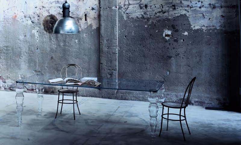 In Italien schaut die Sache hingegen sehr kontrovers aus. Im ersten Augenblick denkt man an riesige, und/oder elendslange Tafeln aus Holz, an denen Großfamilien Platz finden. Aber auch Steinplatten, gekachelte Tischplatten mit unauffälligen Holzbeinen und Metalltische sind durchaus Usus. Es geht aber auch ganz anders. Jüngstes Beispiel ist ein Entwurf der bretonischen Brüder Bouroullec für Glasitalia. „Nesting“ ist ein quadratischer Tisch, wahlweise in Amber, Dunkelgrün oder transparent erhältlich, bei dem Platte und Tischbeine aus Muranoglas sind. Die Tischplatte ist aus dickem, gegossenem Glas, während die zylindrischen Beine geblasen sind. Insgesamt, trotz des Materials, eine ziemlich massive Angelegenheit.
