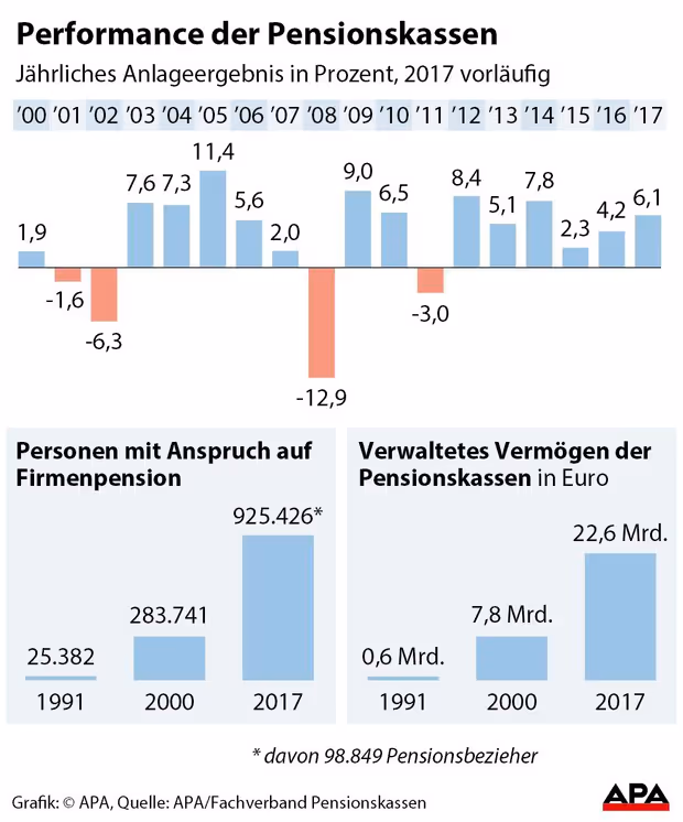 Wien – Dank einer sehr guten Entwicklung an den Aktienmärkten haben die heimischen Pensionskassen 2017 ihren besten Veranlagungserfolg seit mehreren Jahren erzielt. Die veranlagten Gelder gewannen 6,13 Prozent an Wert. Insgesamt bezogen bereits 98.849 Menschen eine Firmenpension. In Summe zählen die Kassen 925.426 Bezugsberechtigte, um 2,5 Prozent mehr als Ende 2016.