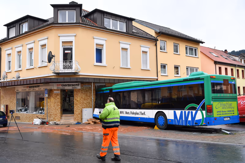 Der Bus war am Dienstagmorgen von der Straße abgekommen, hatte mehrere Fahrzeuge gerammt und war dann frontal gegen eine Hauswand geprallt. Fachleute prüfen nach Angaben der Polizei, ob das Gebäude, in das der Bus krachte, einsturzgefährdet ist. (dpa)
