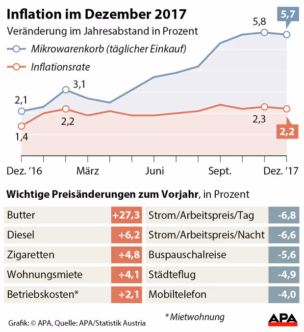 Die Inflationsrate für das Gesamtjahr 2017 lag bei 2,1 Prozent, gab die Statistik Austria heute bekannt. Für den Preisauftrieb sorgten vor allem Gastronomie, Nahrungsmittel, Treibstoffe und Mieten.