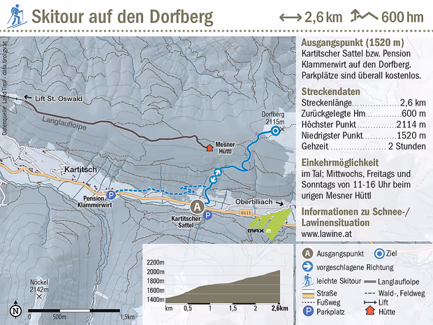 Beim Mesner-Hüttl kommt man auch vorbei, wenn man vom Lift in St. Oswald aus auf den Dorfberg aufsteigt. Für Tourengeher wurde hier eine kostenlose Touren-Aufstiegsroute angelegt. Doch von der Bergstation über den flachen Rücken des Dorfberges hinein ist es ein ziemlicher Hatscher. Auch Langläufer, die auf der Höhenloipe am Dorfberg unterwegs sind, können sich beim Mesner-Hüttl stärken.
