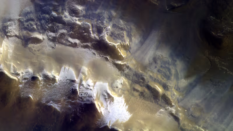 Die Aufnahme der Kamera, die sich an Bord der ExoMars-Sonde befindet, zeigt einen Ausschnitt vom Rand eines mit Eis gefüllten Kraters namens Korolev.
